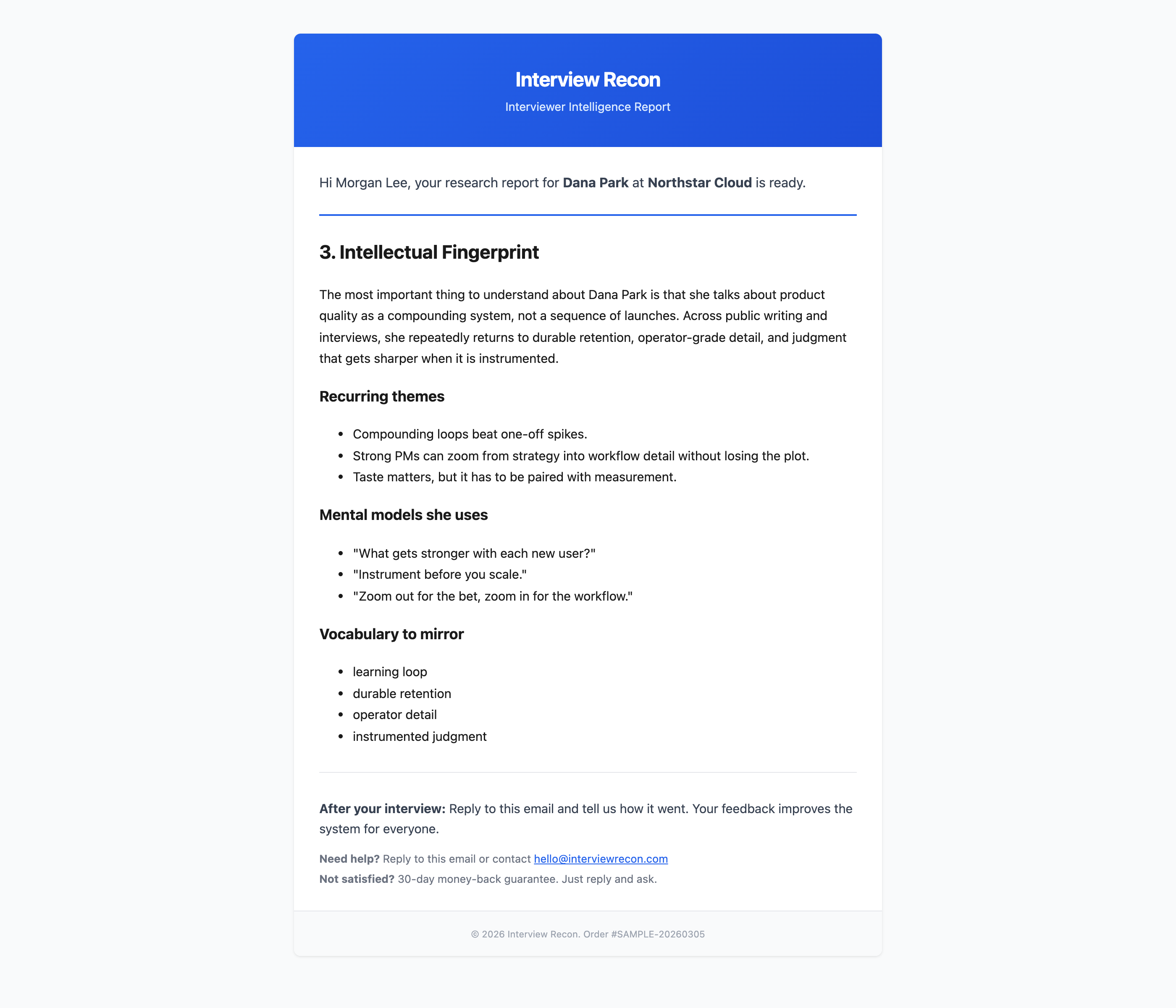 Interview Recon researches your PM interviewers — their product philosophy, talks, and writing — to predict questions with up to 75% accuracy. Get personalized prep in minutes that would take you 10+ hours to research manually.
